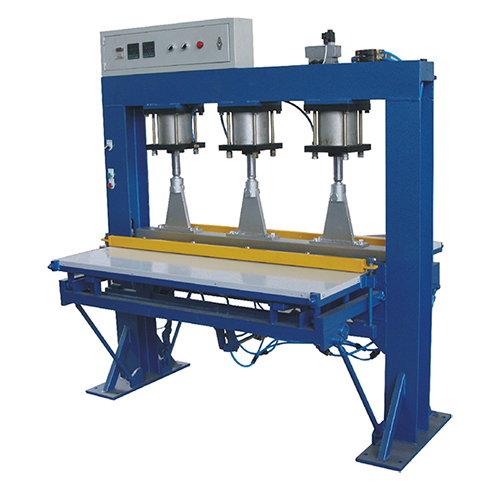 半自動條形熱壓機是將短木芯板經(jīng)過斜磨、涂膠后進行熱壓拼接的一種新產(chǎn)品,它是利用電熱管對熱壓板加熱,上置式氣缸加壓,前后自動送板機構(gòu)送料來實現(xiàn)動作的。工作時只需將單板推到臺面限位擋板處,按下按鈕或腳踏開關(guān),機構(gòu)將自動將單板夾緊、送料及熱壓,并按設(shè)定的時間自動脫開,完成熱壓拼接工藝。